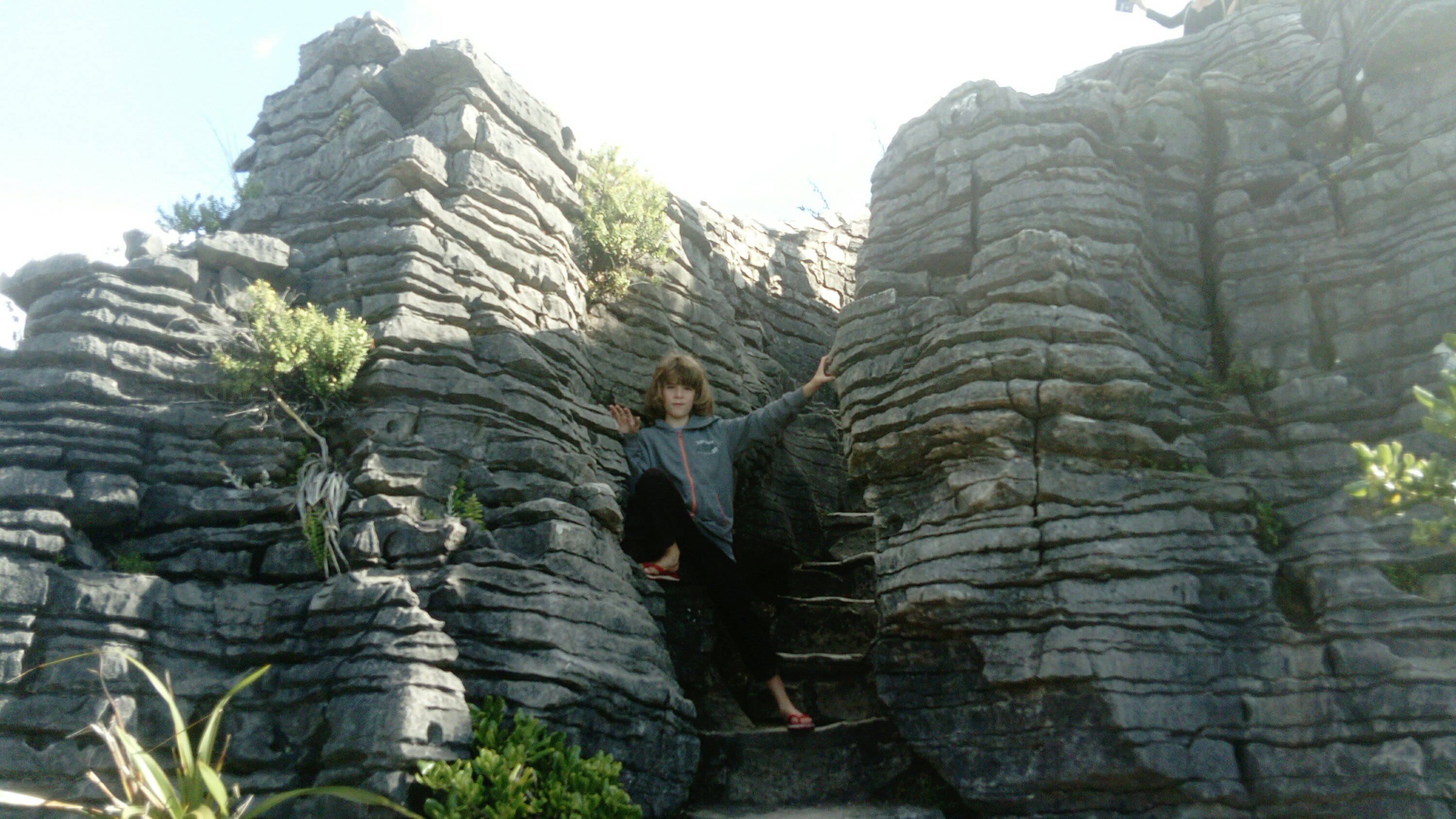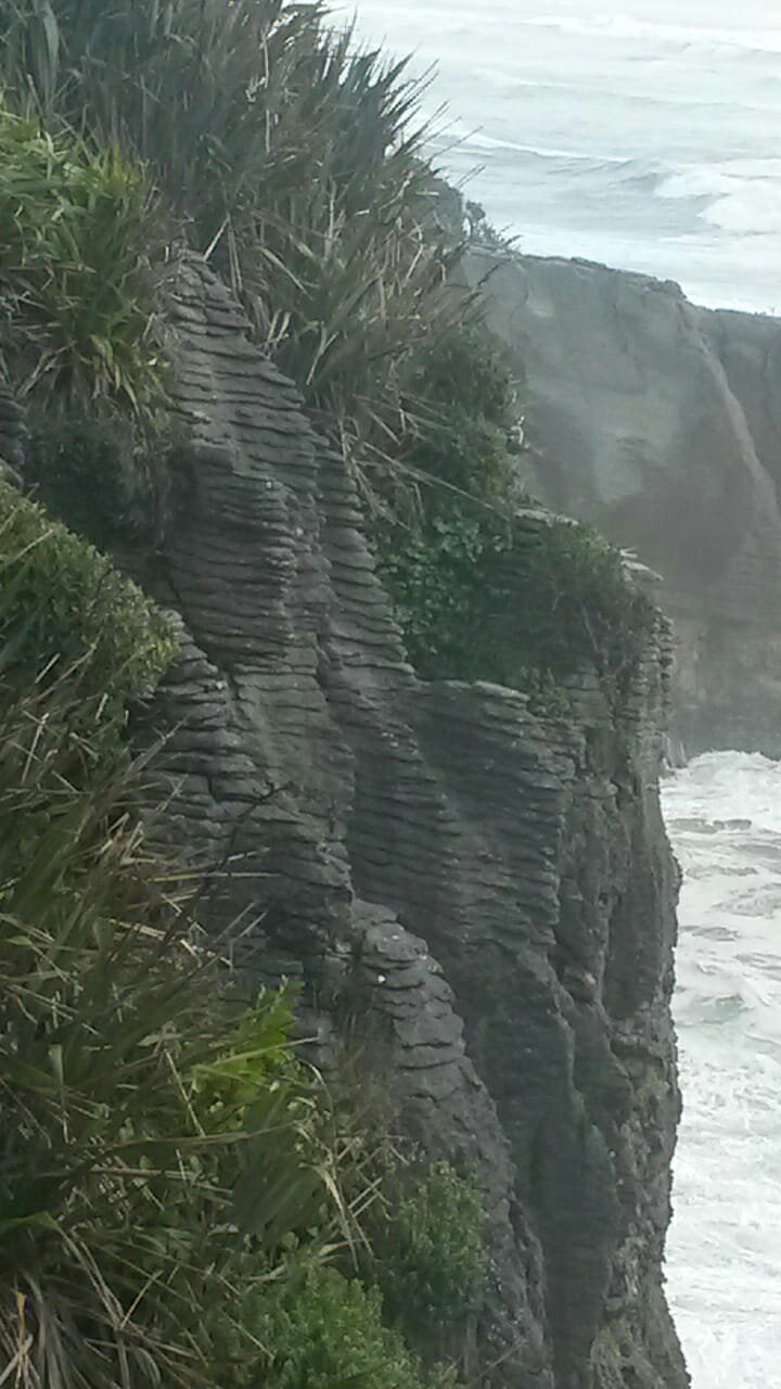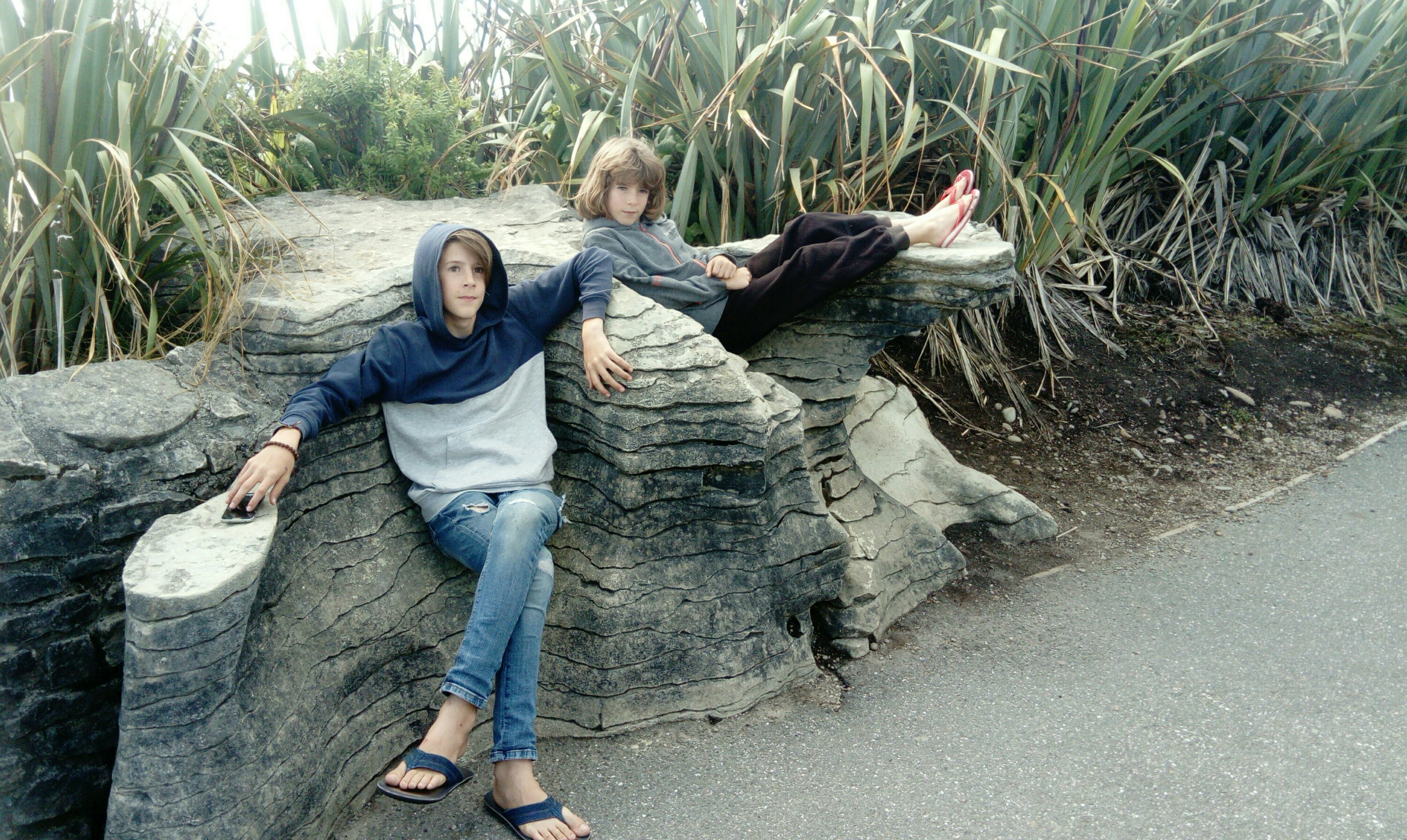 After a short stroll through town and off we go again. For about 30 km, then a big bang, a rattle and a flat tyre. Stuck beside the road, we unloaded the car and Finn, Bill and two phone calls with the previous owner managed to sort it out again. Where is the nearest petrol station? Of course all the way back again to Greymouth. It’s three o’clock now and we start our tour for the second time. Our destination: the Pancake Rocks – a special geographic feature where layers of limestone and clay minerals were pushed up and eroded at variating speed.