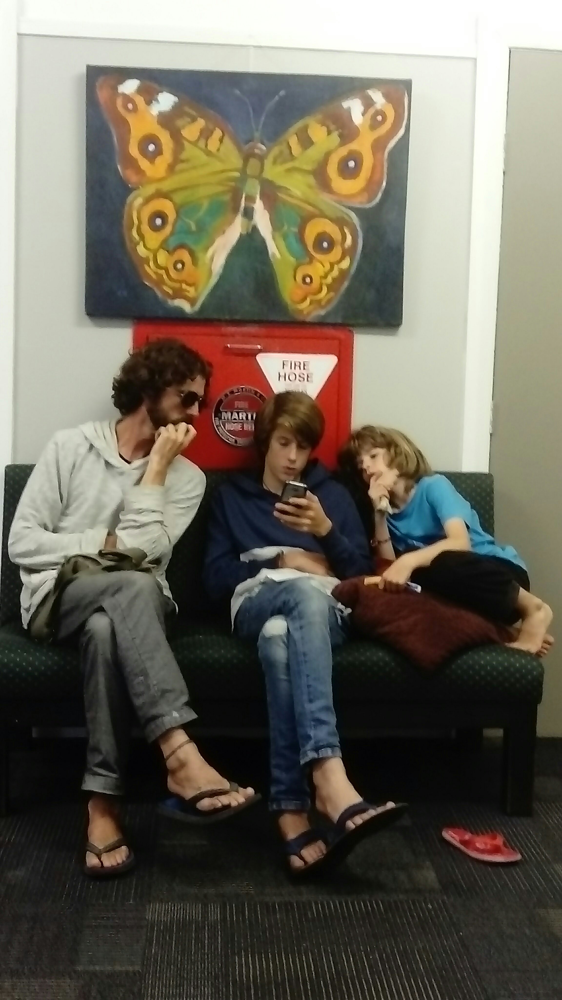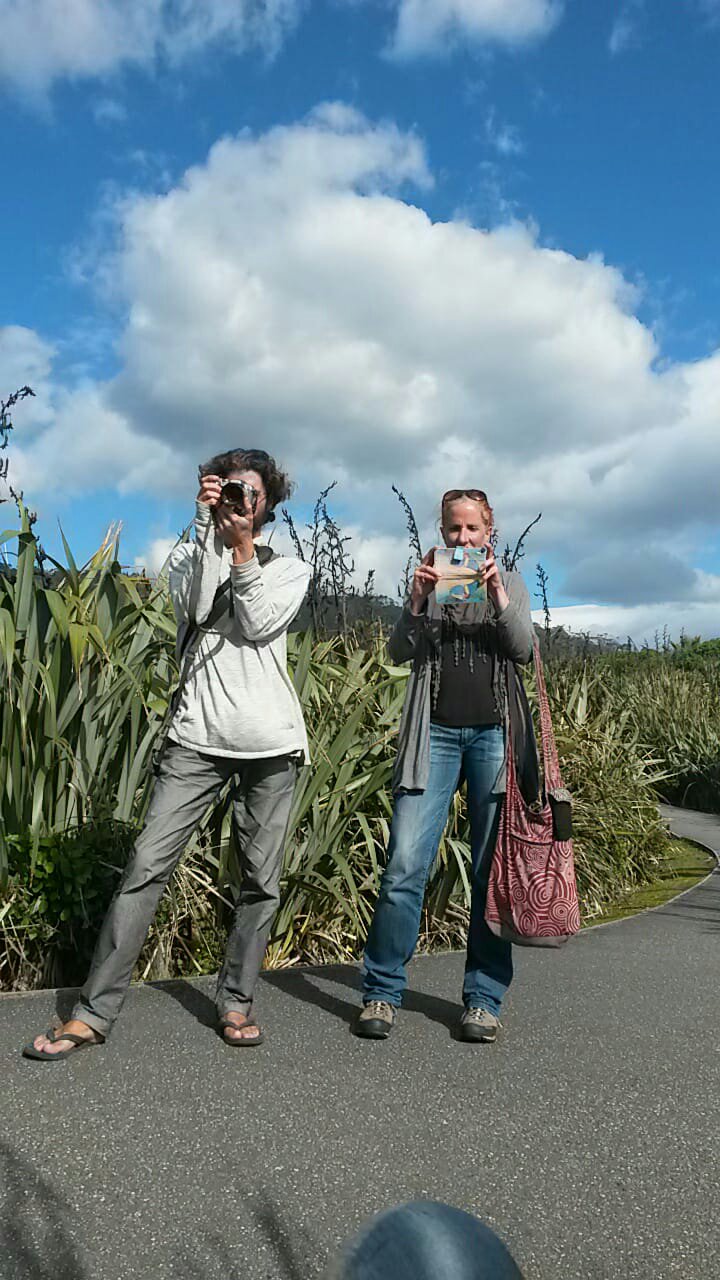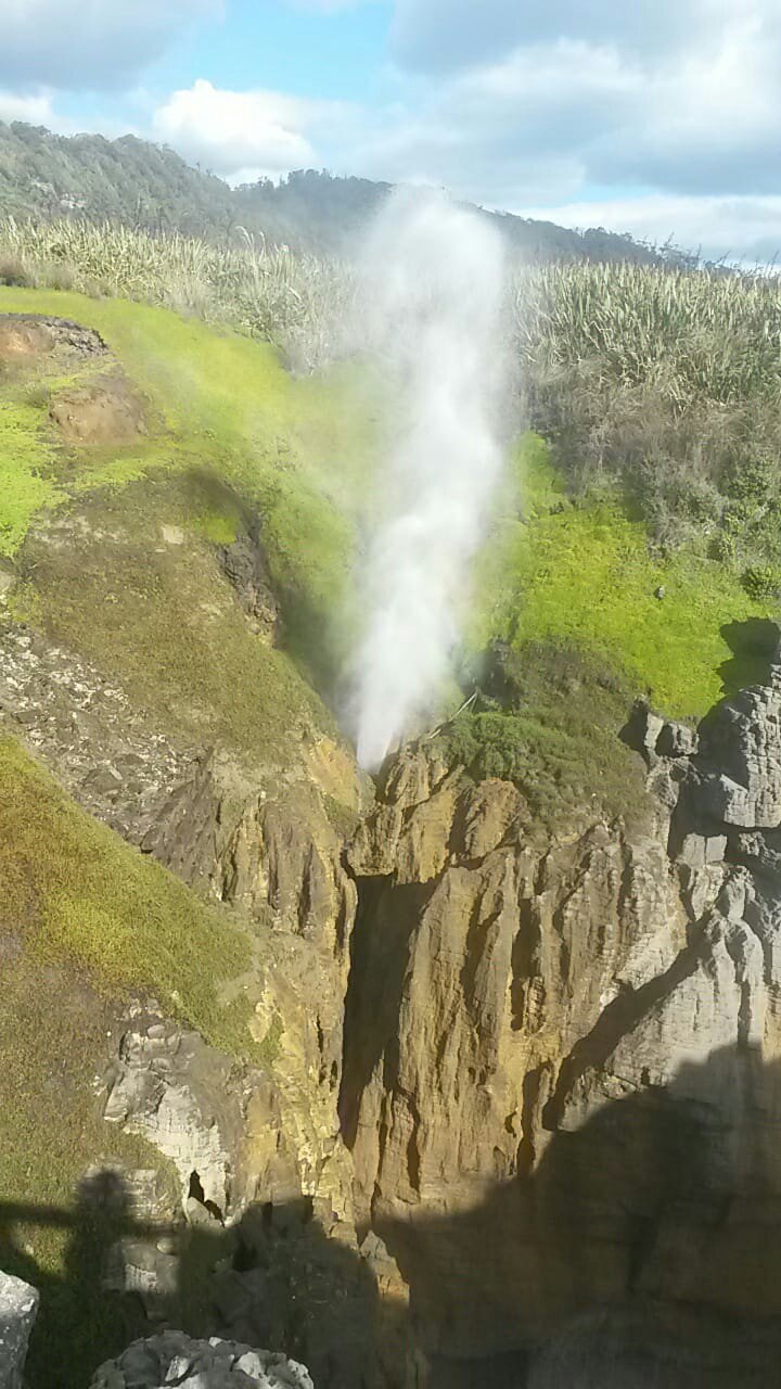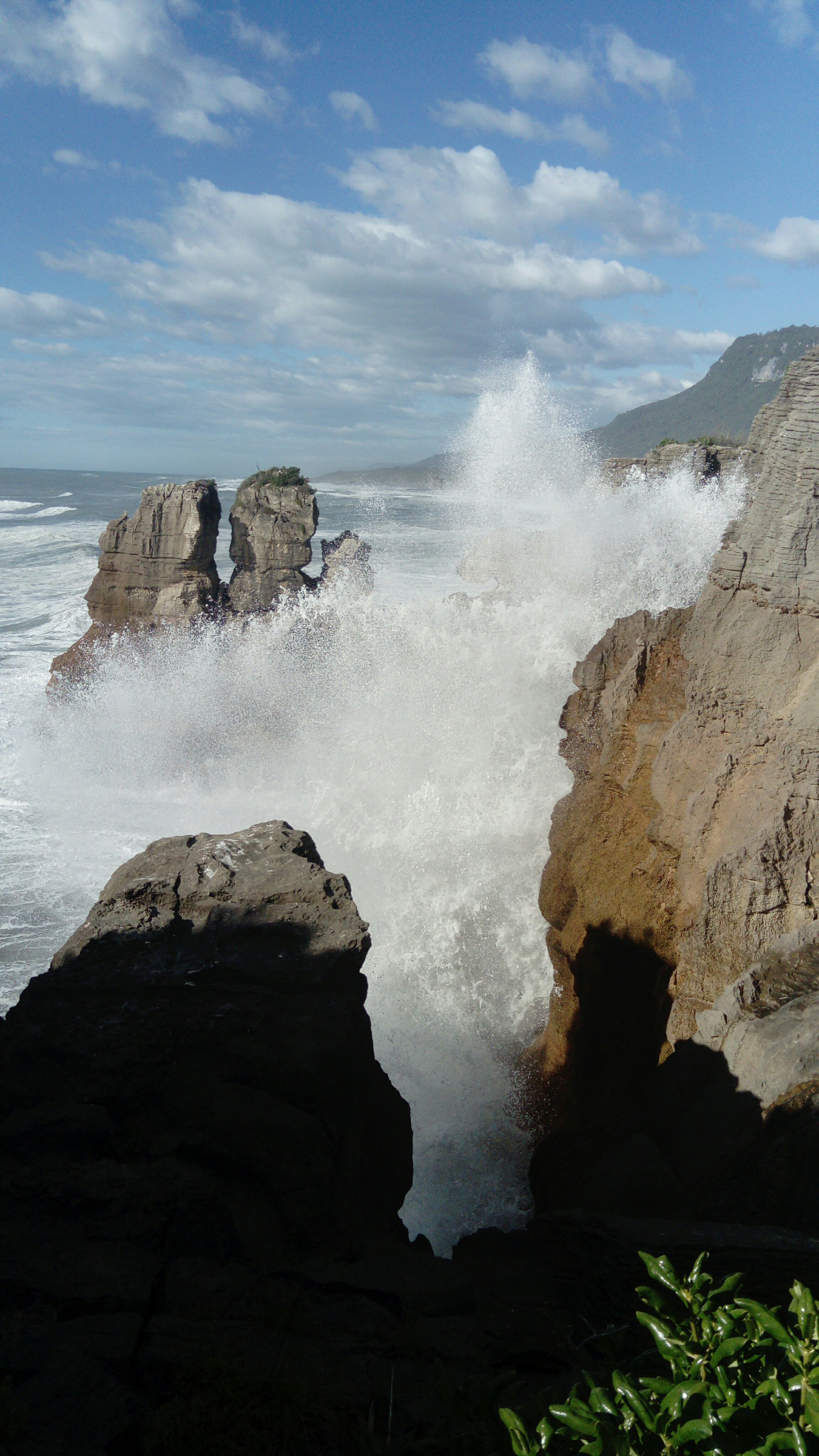 After a short stroll through town and off we go again. For about 30 km, then a big bang, a rattle and a flat tyre. Stuck beside the road, we unloaded the car and Finn, Bill and two phone calls with the previous owner managed to sort it out again. Where is the nearest petrol station? Of course all the way back again to Greymouth. It’s three o’clock now and we start our tour for the second time. Our destination: the Pancake Rocks – a special geographic feature where layers of limestone and clay minerals were pushed up and eroded at variating speed.