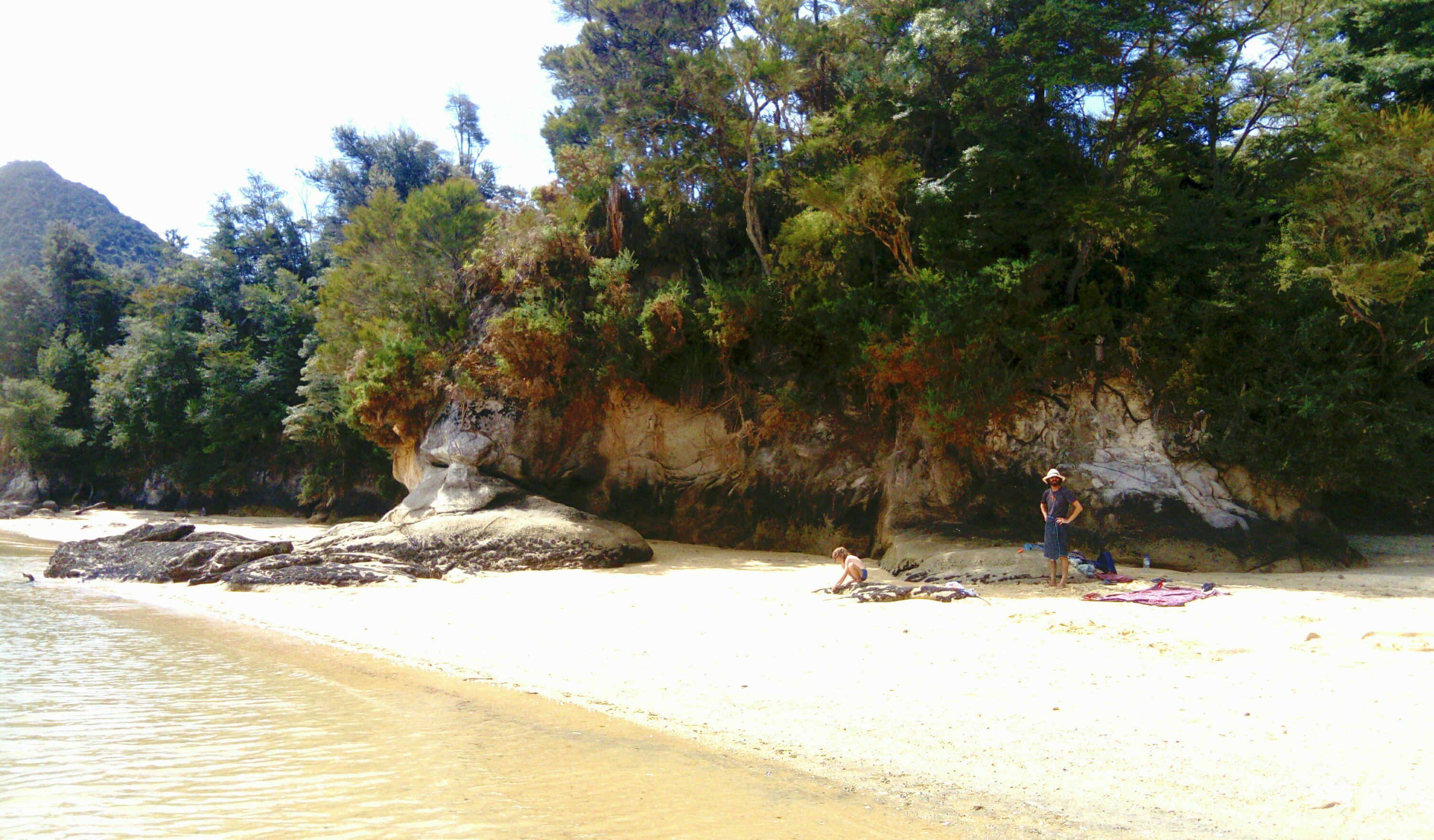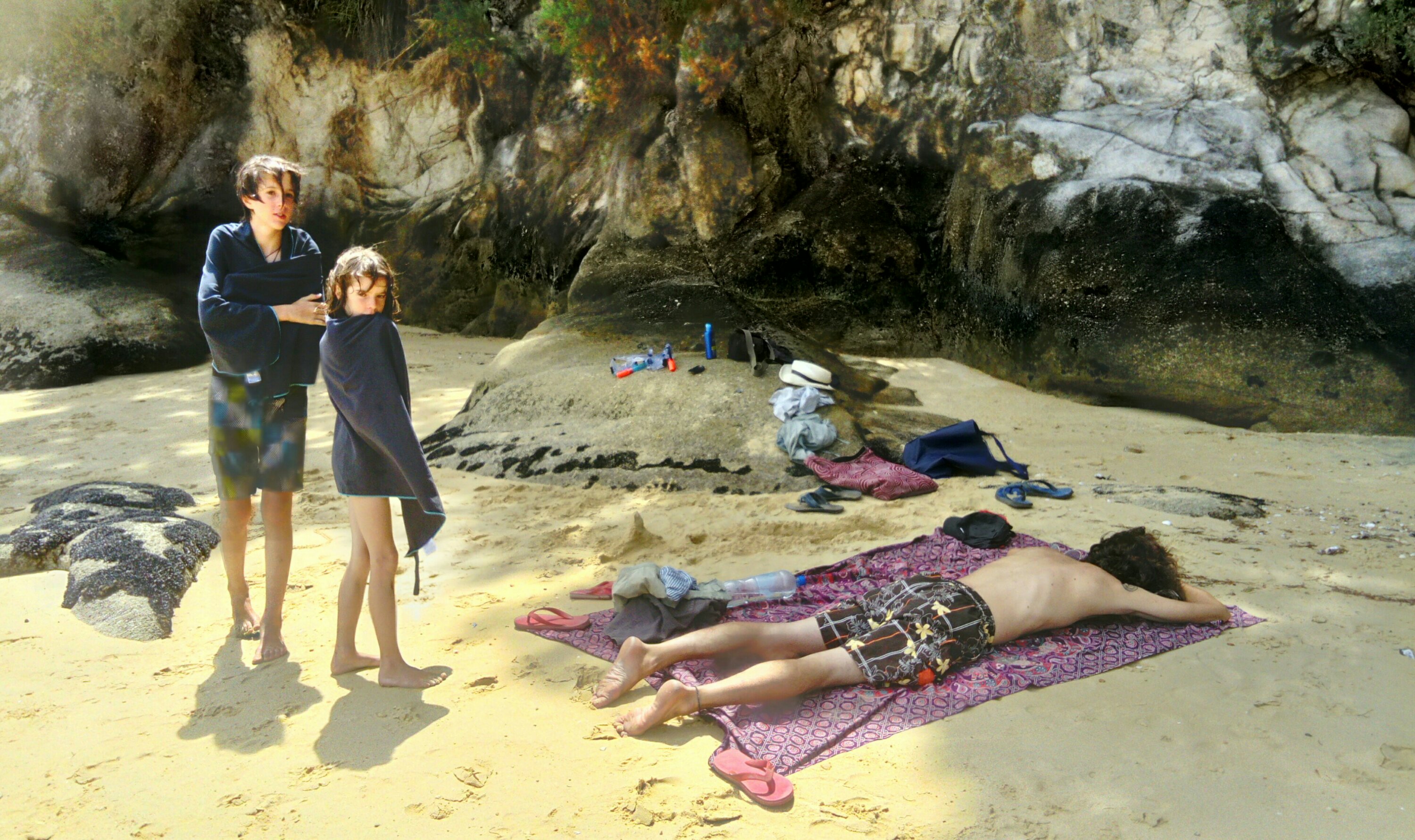 Ahhh, I slept well on the proper mattress, a cosy pillow in Bill and my own room. The four of us headed off to Abel Tasman National Park today for a day tour. On the way there our car died four times while driving. It got us to where we wanted but we arrived rather worried and definitely not relaxed any more. The little walk and lovely beach helped a bit to calm down… The boys had a chance to try out their new mask and snorkel. Unfortunately the water was quite cold but cristal clear.
