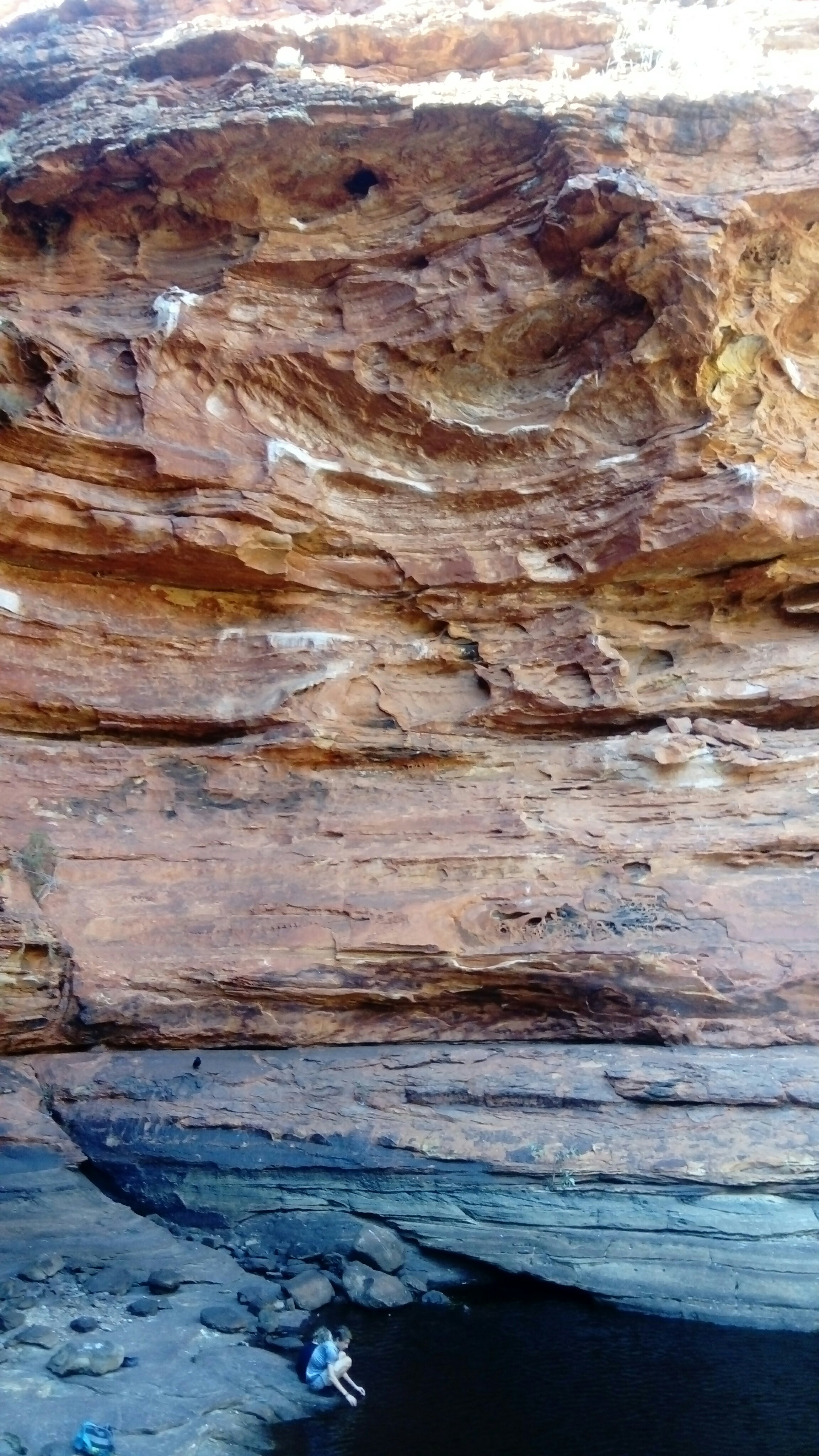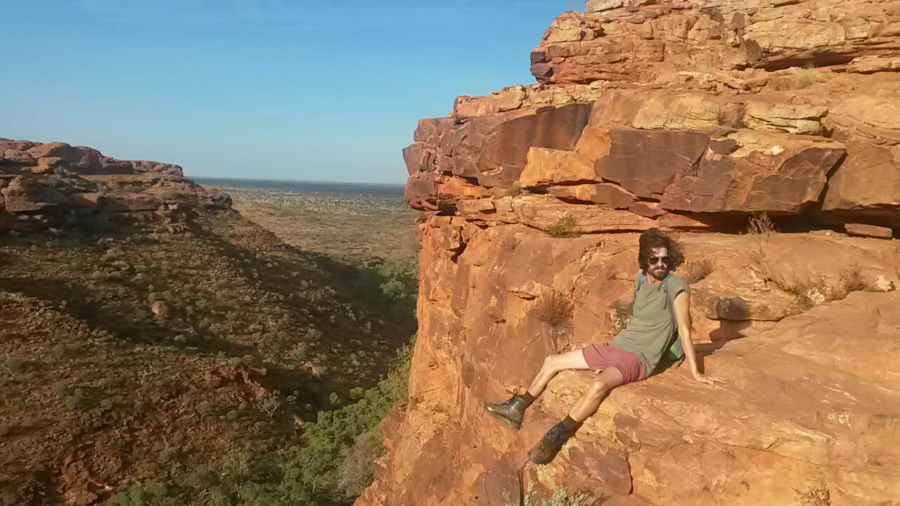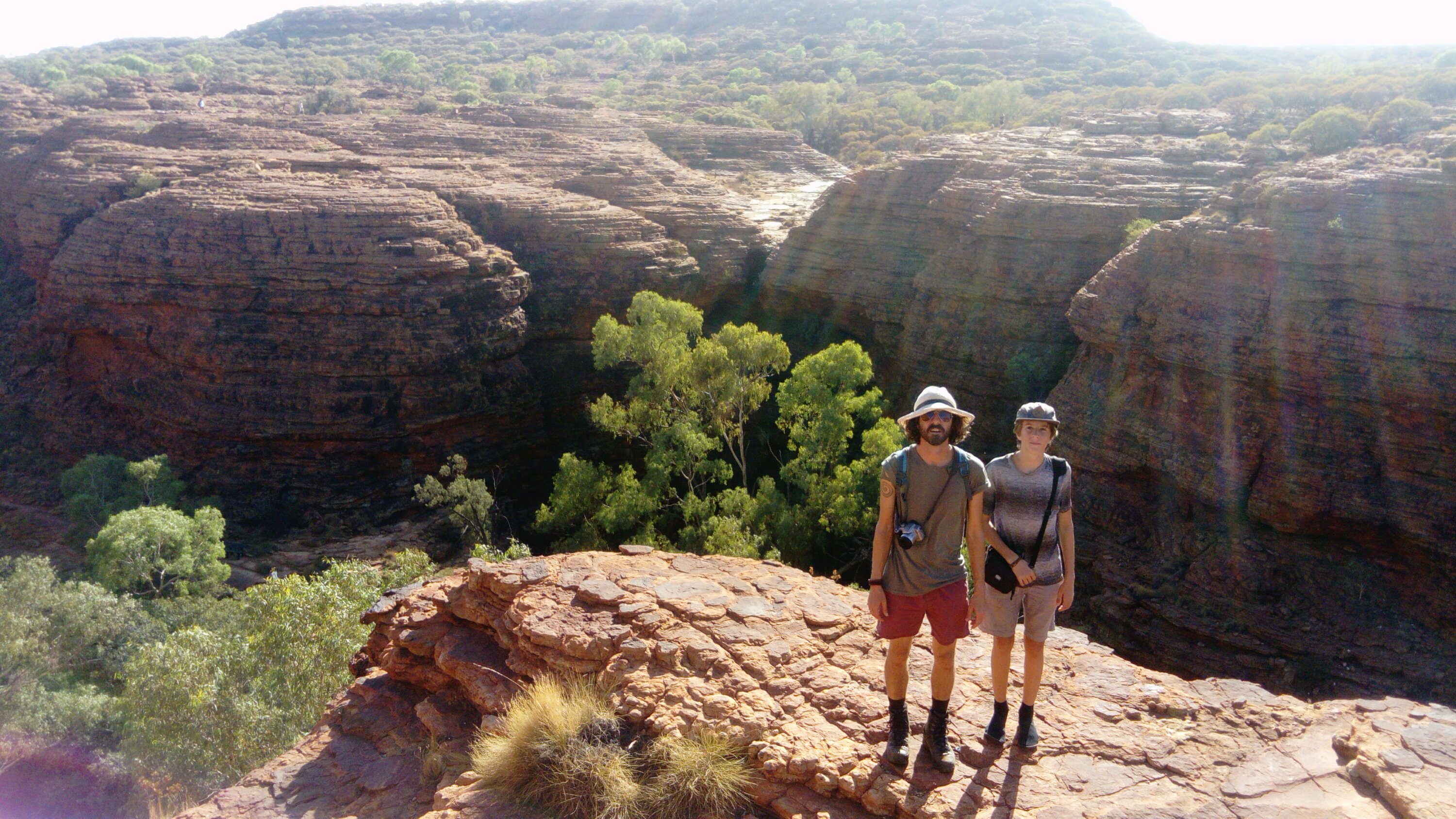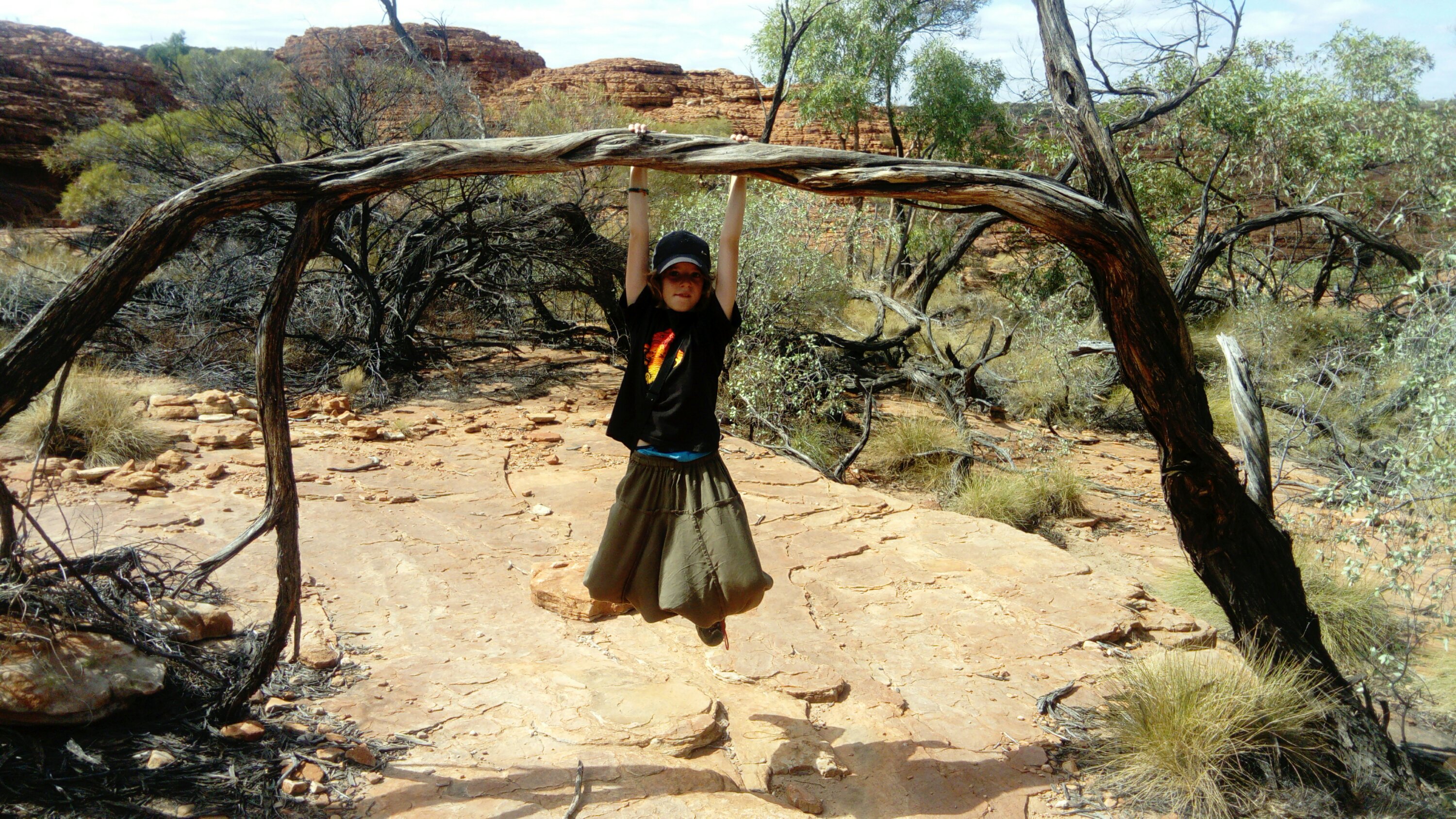 The next day we get up at half past five. It’s still dark but at least half of the campsite is already awake. We want to do the rim walk around King’s Canyon. It’s much more exciting than Uluru as it’s up and down and around rocks, over gaps and ladders, once on top of a 100 m cliff, then in the “garden of Eden”, a waterhole at the bottom of the canyon. Four hours pass quickly, fortunately it’s not as hot as on our last walk and we all have an adventurous and enjoyable time. Amazing what water can create – especially in an arid region.