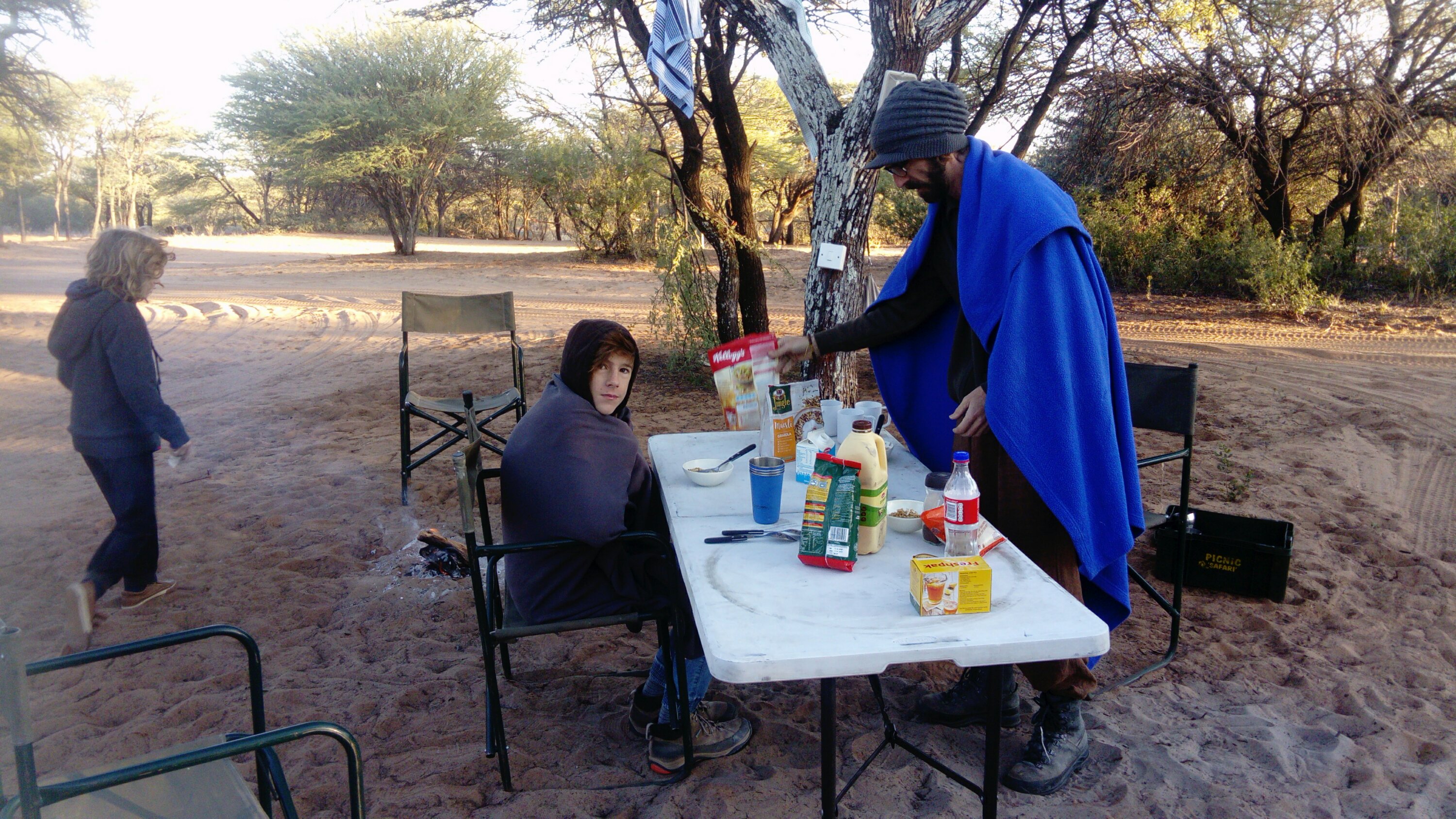 Heute geht’s los! In die alte Heimat. Ich bin total aufgedreht. Aber erst geht es gute zwei Stunden kerzengerade nach Osten. Die Straße ist gut und immer wieder sind Paviane und Warzenschweine am Wegesrand. So wird’s einem nicht langweilig – wenn man mal wach ist…Der Grenzübergang verläuft zügig und problemlos, nicht ganz typisch afrikanisch. Aber wir freuen uns narürlich. Ab jetzt fahre ich. Ein tolles Gefühl – bis ich ein Guinea Fowl erwische. Was für ein Aufprall und Federn fliegen im Rückspiegel. Aber weiter geht’s. Erst ne Stunde später zieht Bill den armen Vogel am Flügel aus dem Schutzgitter der Lüftung (nachdem das Bein bereits nachgegeben hat). Ein kleiner Schaden ist entstanden, was wir wohl melden sollten, oder nicht? Kurz vor Sonnenuntergang erreichen wir Ghanzi, eine größere (und die einzigste) Stadt im Westen der Kalahari. Beim Geldabheben werden wir darauf aufmerksam gemacht, dass unser Nummernschild vorne fehlt. Ach du dickes Ei! Ist uns gar nicht aufgefallen. Was jetzt? Zurückfahren brauchen wir heute nicht mehr, da zu weit und zu dunkel ist. Und wer garantiert, dass das Schild noch auf der Straße liegt. Bill ist am Ende. Geht es jetzt so weiter wie wir aufgehört haben? Ich bin guter Dinge, schließlich sind wir ja jetzt in Botswana. Da kann doch nichts schief gehen, oder? Wir zelten auf Empfehlung auf dem Zeltplatz der Tautona-Farm mitten im Bush. So schön aber auch verdammt kalt. Wir frieren alle bei knappen 0 Grad.