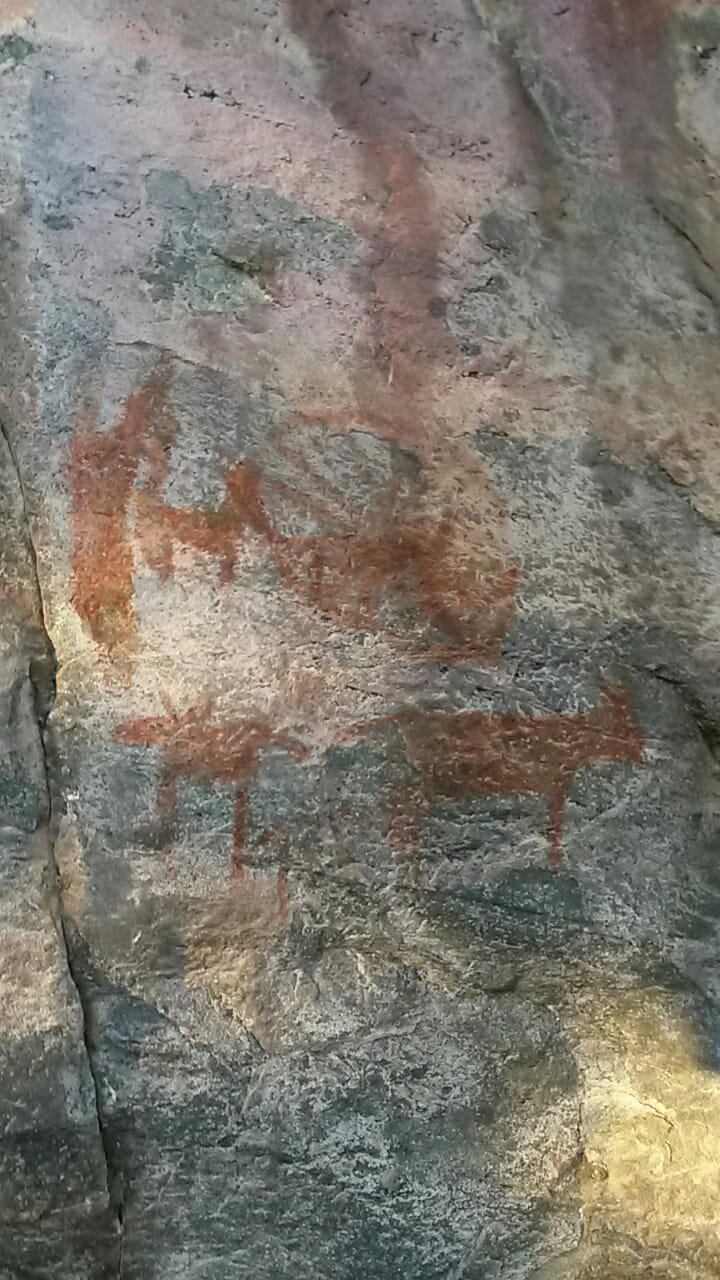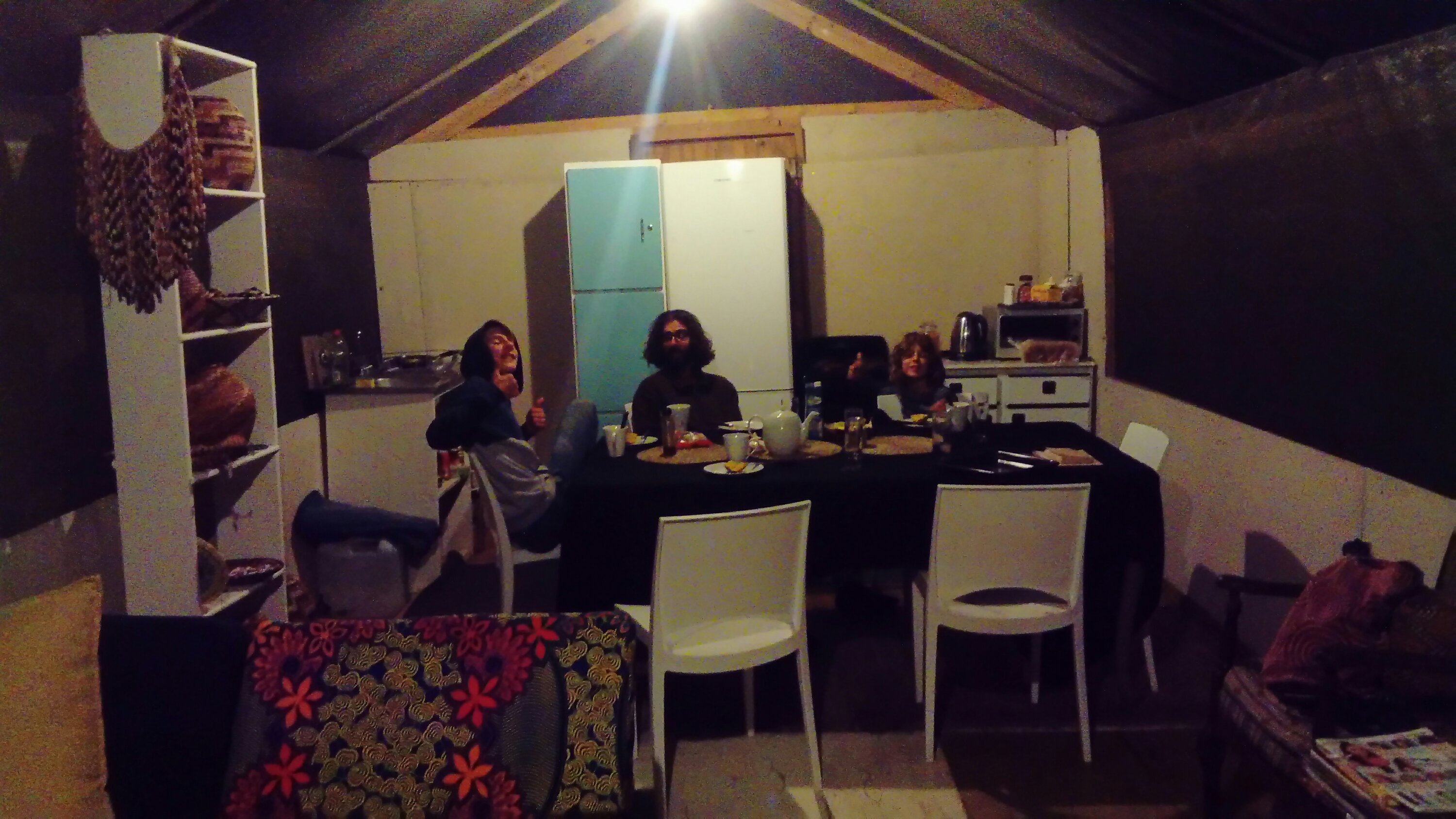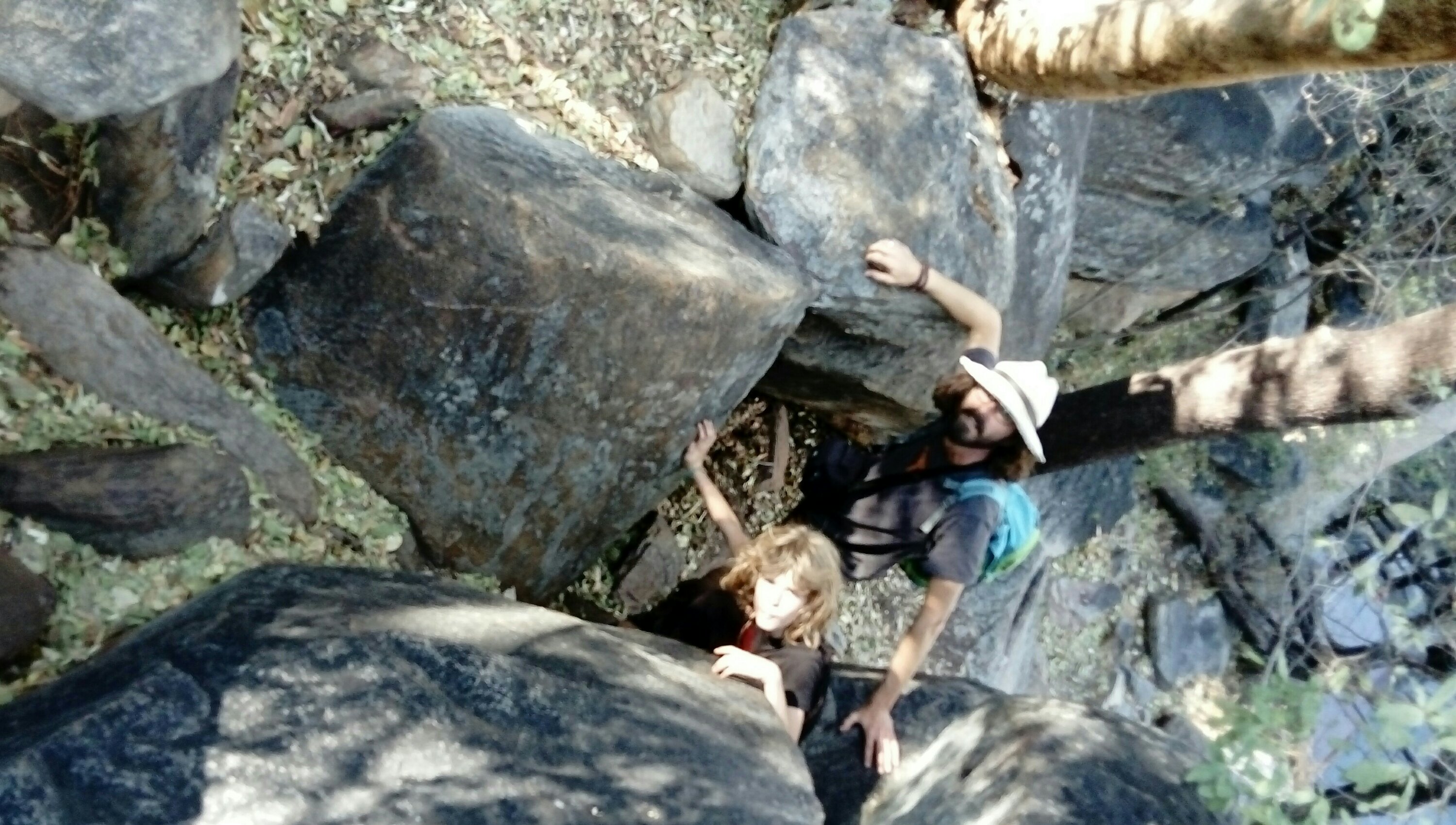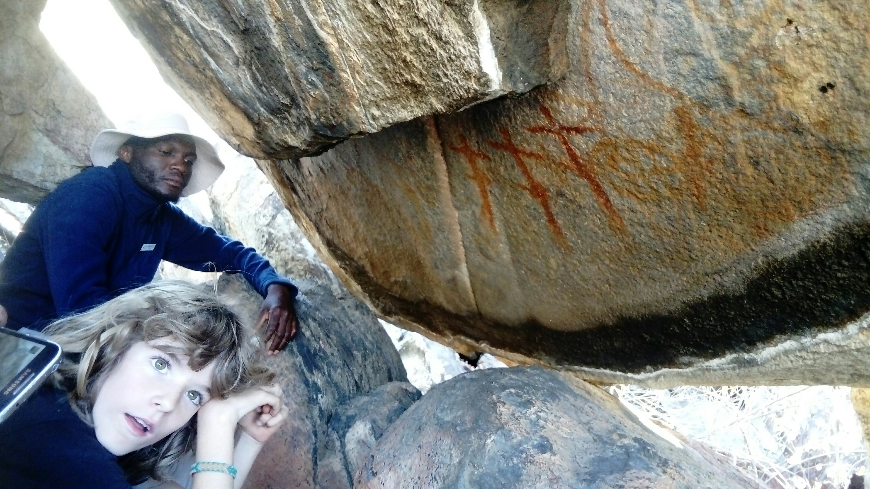 We do a two hours guided walk around the female (the mountains/hills are called “male”, “female” (who is male’s girlfriend) and the “child”. We see a lot of paintings, an old used cave, a former settlement area, weird trees and we meet a couple who turned out to be angles in disguise. They are fascinated by Bill’s drawing in the sand trying to explain the Fibonacci sequence to the boys. By talking to them they mention that they have a farm with a tented sight.The three dancing penises.