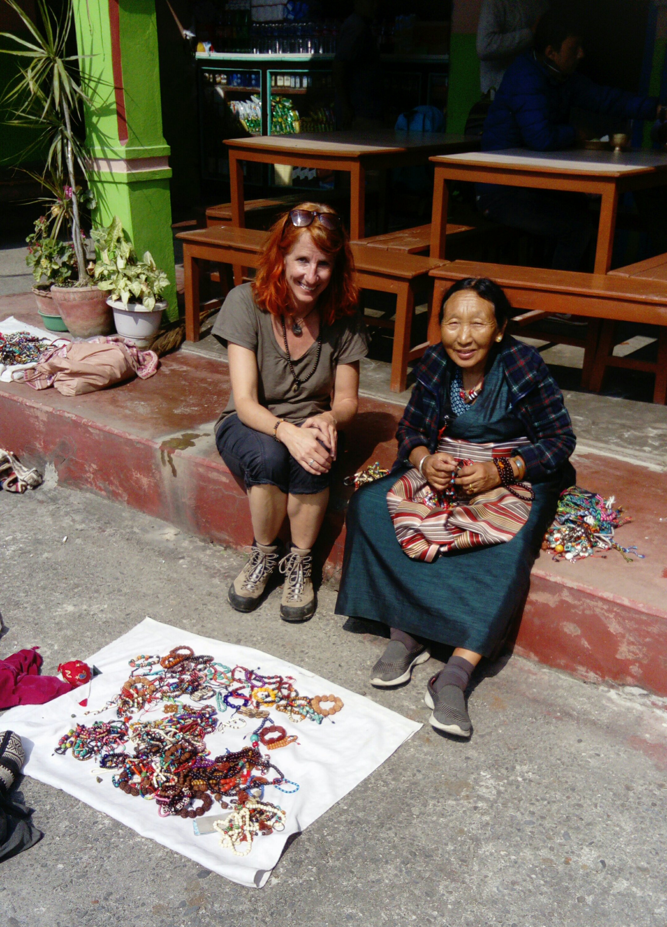 Wir haben eine mehrtägige Wanderung geplant. Nachdem die Rucksäcke gepackt, Überflüssiges im Hotel verstaut und wir gut gefrühstückt haben geht’s mit dem Taxi nach Phedi. Dort werden wir gleich von Tibetischen Flüchtlingen abgefangen, die uns ihren Schmuck verkaufen wollen – da gibt man doch gern gleich ein paar Euros aus… und stärken uns noch einmal mit dem typischen Milktea.