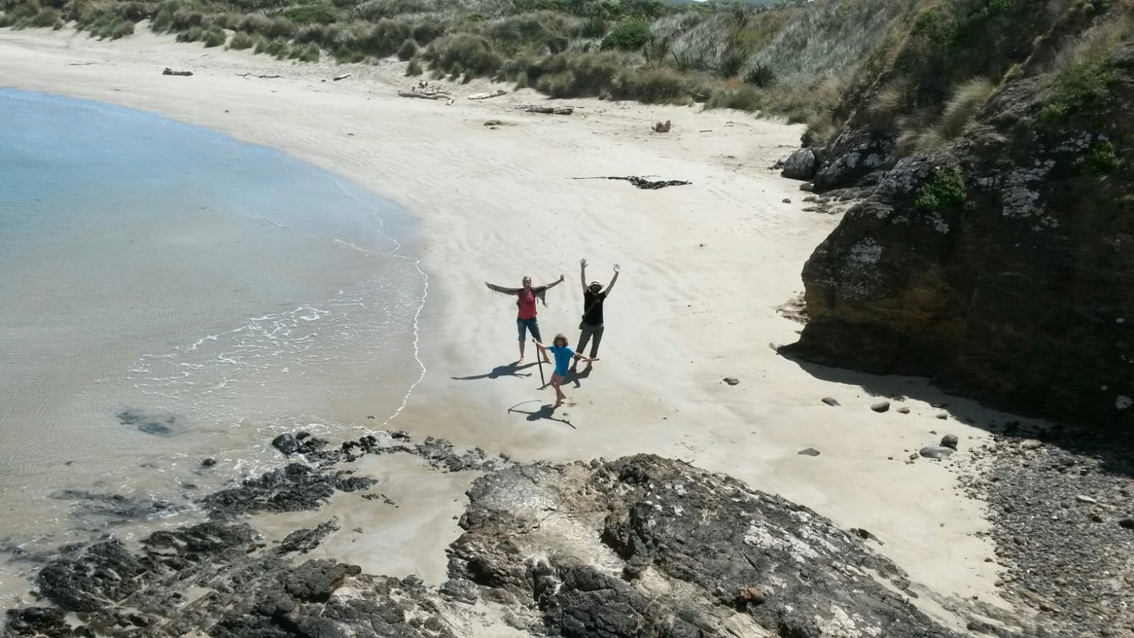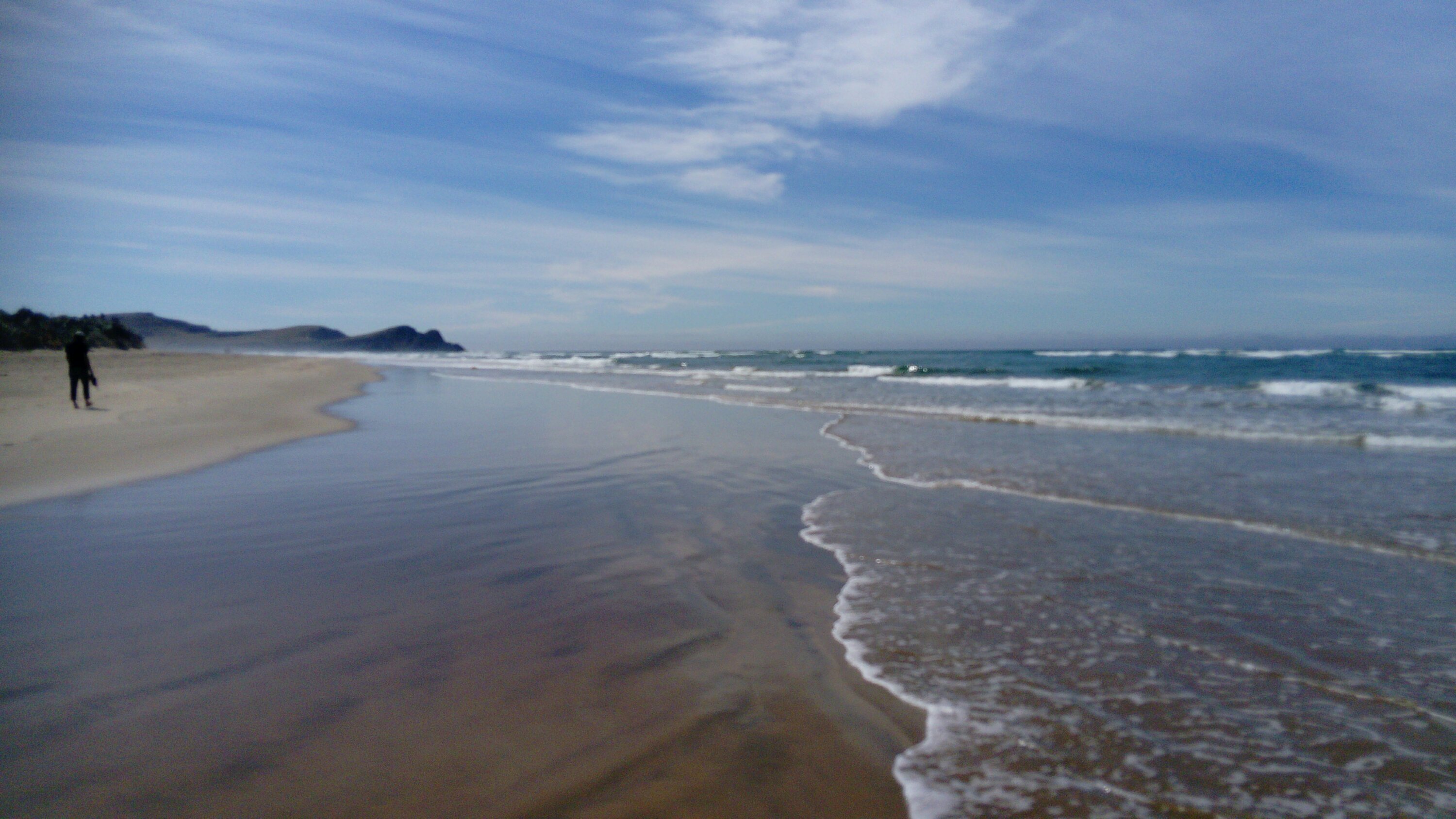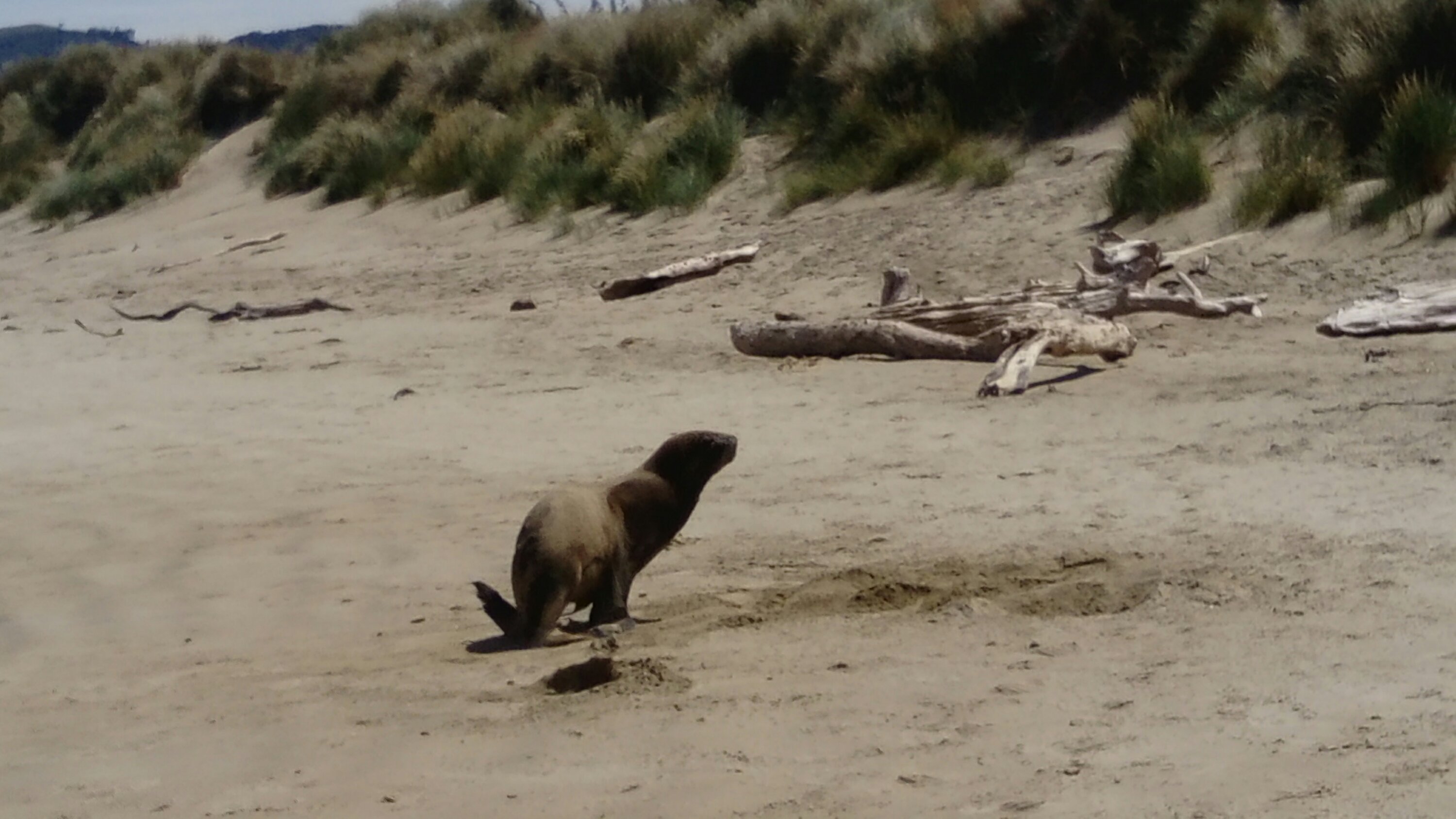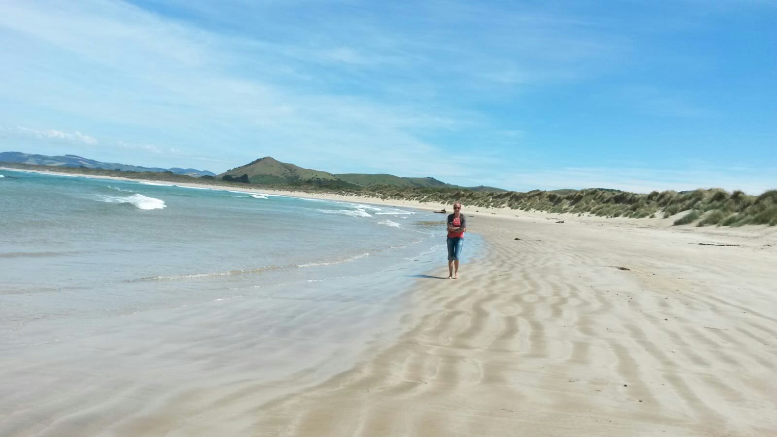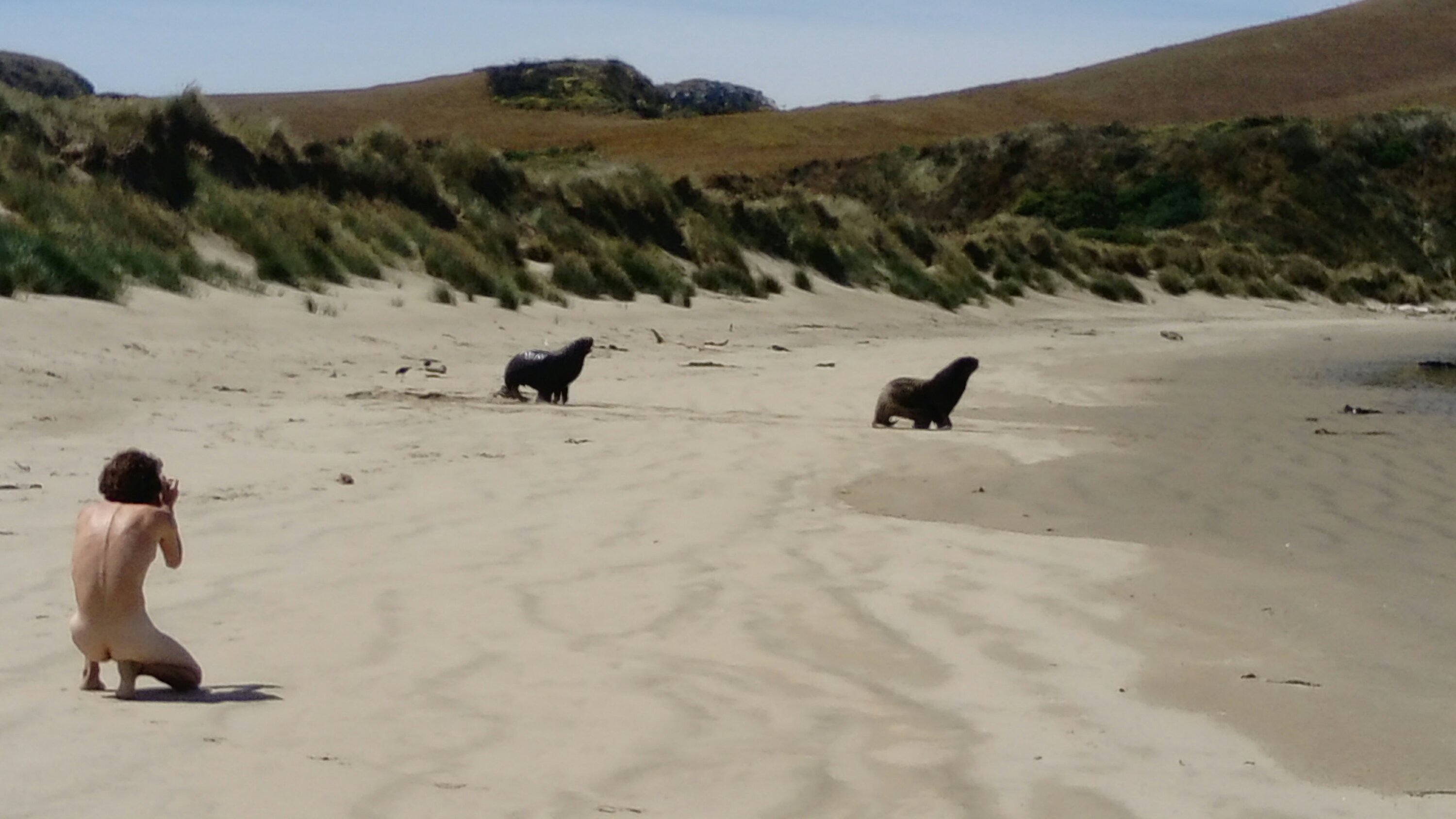 The next day an absolutely stunning sunny day. Long Beach walk and I did it: I had a dip in the Southern ocean. Freezing cold but there’s me, naked, on one side New Zealand on the other side, about 4600 km away, the Antarctica. Bill had to follow… Then: two naked grown ups, two fully dressed kids and two sea lions on an empty, spotless clean beach…